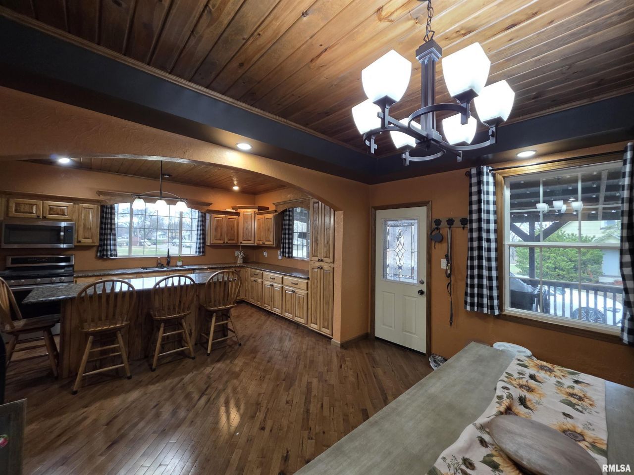 Beautifully updated 1,512 sq ft home with high-end finishes throughout! Stunning diagonal hardwood flooring sets the tone as you enter, leading into a show-stopping kitchen and dining area featuring granite countertops, custom cabinetry, and a gorgeous wood-slated ceiling that perfectly complements the flooring. Arched doorways add character and charm. The living room impresses with a vaulted ceiling, exposed beam detail, matching wood ceiling accents, and abundant natural light. The updated main bathroom offers modern finishes, while the primary suite features hardwood floors and a spa-inspired ensuite complete with granite vanity, jacuzzi tub with built-in shower, and custom tile surround. Solid hardwood doors and trim elevate every room. The laundry room doubles as a functional mudroom with backyard access. Solar panels on the home and garage provide energy efficiency benefits. Outside, youll find an oversized 3-car garage with new siding, soffits, garage door, and newer roof. A separate workshop/garden shed with lean-to offers additional storage or shaded patio space. This home blends craftsmanship, warmth, and thoughtful design, truly a standout property.