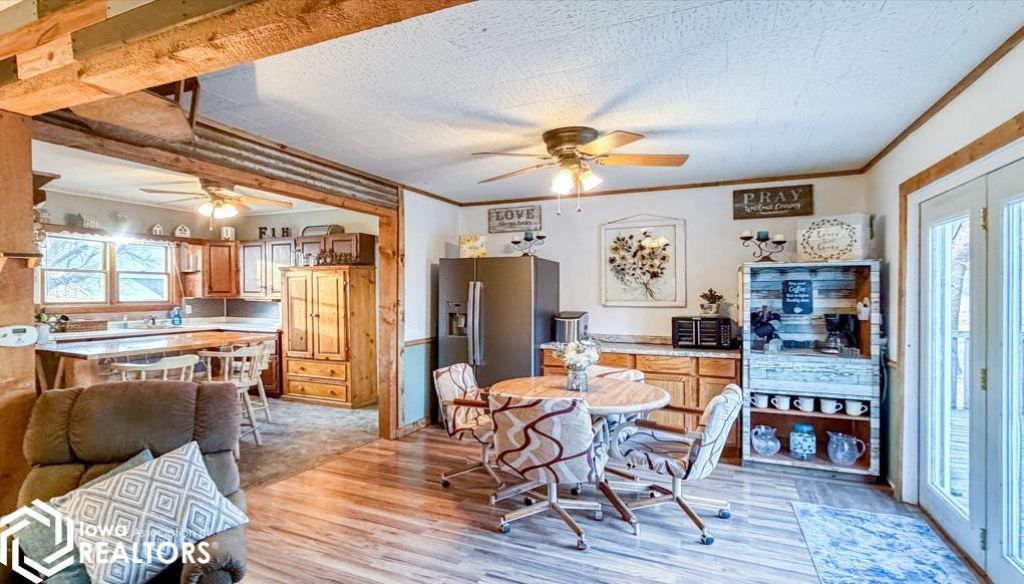 This charming farmhouse style home sits on 4.6 acres just 1 mile from the center of town and only 2 miles from a small rec lake, giving you that country feel without being too far. Inside you'll find 4 bedrooms and 1 full bathroom with warm, cozy farmhousevibes throughout the main living space. The wooden deck overlooks the playhouse and part of the land, making it the perfect spot to relax. The entryway is currently being used as a dog area, but could easily be converted into a mudroom. Outside, there's 1 acre of farmable ground currently planted in alfalfa. The large barn features a steel roof and includes two separate heated shops. Each shop has its own furnace, three access garage doors for vehicles or tractors, and a 2-stage air compressor. There's also a two-car detached garage with an attached shed, plus another shed in the back that has a 12-foot door tall enough for a truck. Most of the sheds could use a little TLC, but they are fully usable. Privacy trees line the yard and there are two 500-gallon propane tanks, one of which is dedicated to the barn. The septic system is being sold AS-IS, and the bins are not part of this property. Come and give this house a tour!