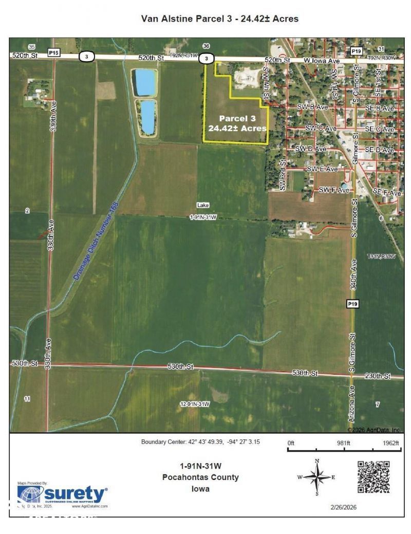 Open farm lease for 2026! Waste no time and start earning profit immediately! Located just west of Gilmore City, Iowa, this farm is in the heartland of Iowa with great productive potential for corn and soybean crops. The property offers three separate parcels totaling 324.52± acres near local grain markets in Gilmore City. With field locations on hard surface roads, along with 4 round steel bins for storing grain, this farmland is an excellent addition for a local farmer or an investor looking for diversification. Mineral rights vested in current ownership will be conveyed along with the farmland, so the potential exists for future mineral income. Parcel 2 includes a grain bin site with 4 actively used bins with a total storage capacity of approximately 25,000 bushels. It also has a 30' x 36' Quonset shed for additional equipment storage. Parcel 3 boasts an outstanding CSR2 of 88.1 and is currently in hay production as well as the conservation reserve program (CRP). The CRP contract expires on September 30, 2026, allowing the opportunity for row crop production or expanded forage opportunities in the 2027 growing season. This field would be an excellent candidate for potential organic certification since it has been in a CRP contract for nearly 10 years. Rental Status: Current farm lease is terminated effective March 1, 2026. Full possession will be provided to the buyer at closing.