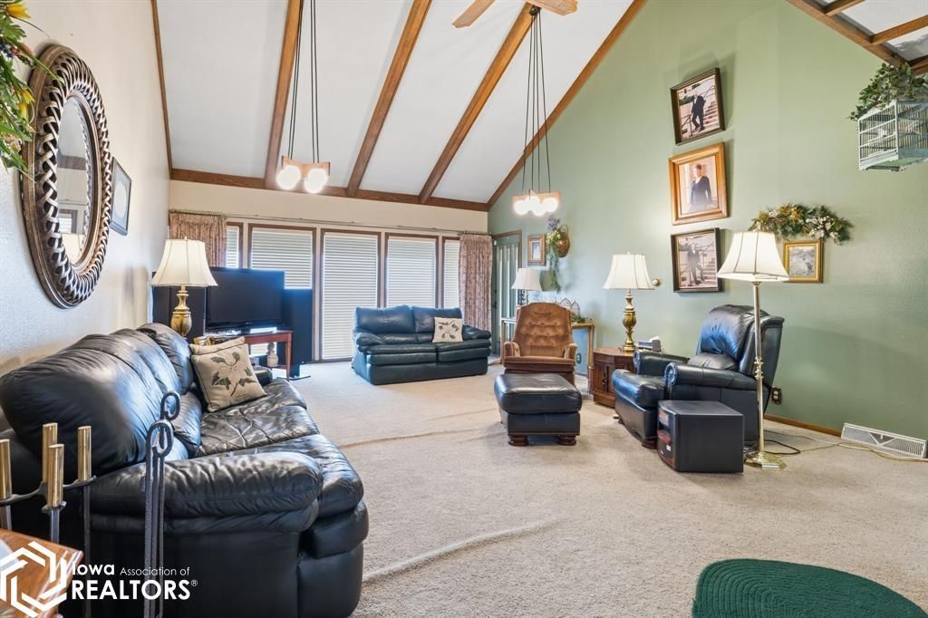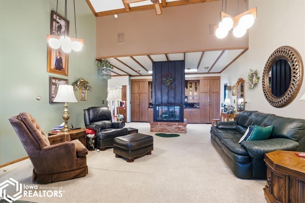 Looking for a home with true WOW factor? It starts in the living room. Step inside to a breathtaking oversized family room with soaring vaulted beamed ceilings and a dramatic freestanding floor-to-ceiling fireplace that anchors the space. It's not just a living room ? it's the showpiece of the home. The dining area flows seamlessly into the kitchen where vintage charm shines. Bold red countertops are in fantastic condition, and the pristine 70's flooring looks like new. Complete with a built-in oven, cooktop, walk-in pantry, and spacious laundry room, the kitchen blends personality and function. A formal living room offers flexible space for an office or sitting area, plus an adjoining room ideal for a home office, studio, or even an expanded primary suite option. Upstairs features three generously sized bedrooms with great closet space. The finished basement includes a family room, ¾ bath, office area, and a large flex space with tall ceilings ? perfect for a gym, playroom, or studio. Situated on nearly an acre in a private setting, this property also offers a 1-car attached garage and a detached 2-car garage. The durable metal roof is designed to look like classic shakes, giving you timeless curb appeal with long-lasting performance. Located on a hard-surface road for easy year-round access and conveniently close to Ottumwa and Oskaloosa, this home combines architectural character, space, versatility ? and the kind of presence that's hard to find.