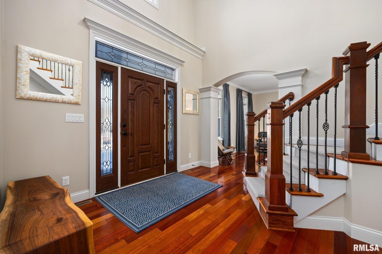 This superior crafted updated home is loaded with the finest of amenities that blend effortlessly into a functional and unique floor plan. Elegant formal living and dining spaces off the gracious two story foyer lead to cook's dream kitchen anchored by a custom island. The vaulted sunroom leads to large composite deck overlooking the wooded rear grounds. A large cozy family room with stone surround fireplace. Main floor office with access to full bath. An incredible primary bedroom retreat with huge spa bath and custom fitted walk-in closet fit for a Queen. Three additional upper level suites with custom fitted walk-in closets, bath access, and own 3rd floor loft spaces! Don't miss the upper level updated home gym and laundry room! The lower level is equally impressive with handsome bar, theater, 5th bedroom, workshop, and walk-out access to huge stamped and stained patio with fireplace. Plenty of storage space including finished attic space in the over sized 3 car garage! Set on nearly an acre lot with plenty of green space, ziplines, and mature wooded backdrop for added privacy. Minutes to public schools, shopping, dining, and interstate access. Life's too short for ordinary. Unlock extraordinary at 919 Copperpoint Drive.